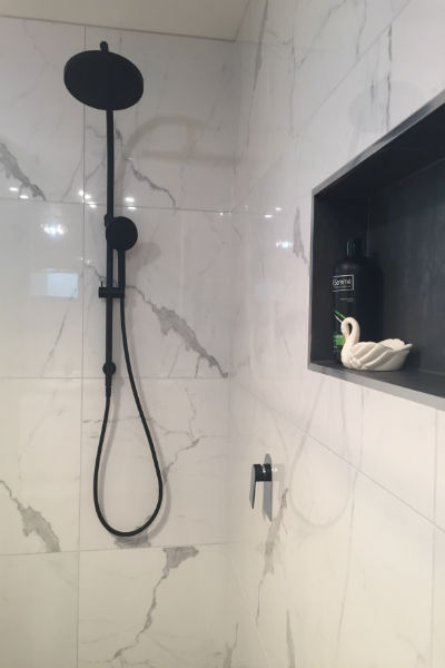 The joiners were challenged to create a ‘one off’ vanity with Hardwood benchtops. The matte black tapware was chosen to compliment the marble wall tiles and grey floor tiles help bring the most out of the marble. A truly contemporary makeover!